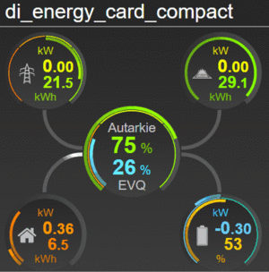 Hier wird eine Version der Energie-Karte mit Hilfe der DOIF-SVG-card-Funktion realisiert. In dieser Darstellung wird zusätzlich der Verlauf der jeweiligen Leistungen und der Speicherkapazität visualisiert. Die Konfiguration bzw. Anpassung an eigene Bedürfnisse sind wie bei der kompakten Energie-Karte oben vorzunehmen. Sollten beide Version gleichzeitig genutzt werden wollen, dann müssen die programmierten Perlfunktionen einer Version umbenannt werden, sonst überschreiben sie sich gegenseitig, weil sie im gleichen Package liegen.