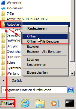 Nachdem man sich mit dem Benutzerkonto angemeldet hat, öffnet man den Autostart Ordner des Benutzers über die Sequenz "Start" - "Alle Programme" - (Rechtsmausklick)"Autostart" - "Öffnen"