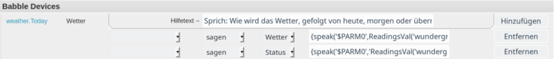 Damit erscheint dieses Device mit FHEM-Devicename wunderground und Babble-Devicename Wetter in der Liste der Babble-Devices. Im nächsten Schritt müssen dafür Kommandos angelegt werden. Da bei der Analyse der Zeitwert (heute,morgen oder übermorgen) in der Variablen $VALUE abgelegt wird, reichen zwei Kommands aus, indem die Fallunterscheidung untergebracht wird: