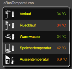 Es sind auch noch einige Mustertemplates vorhanden die auf Basis von readingsGroup erstellt wurden und ein farbiges Design besitzen. Diese Templates werden nicht im Device, sondern im Room „eBus“ angelegt. Der Kreativität der Anwender sind hier fast keine Grenzen gesetzt, die Werkzeuge sind vorhanden.