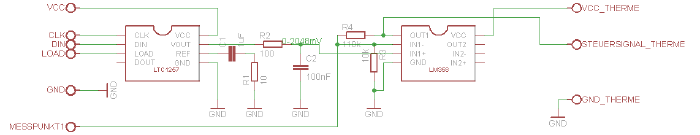 In diesem Fall hat VCC_Therme eine Spannung von 24V. Der LM358 kann bis 32V arbeiten, dann muss jedoch VCC_Therme auf 32V angehoben werden und der Widerstandswert von R4 auf ca. 150k Ohm erhöht werden. An dem Steuersignal_Therme liegt je nach dem welchen Wert der LTC1257 gerade in einen anlogen Wert umsetzt eine Spannung von 0-24V. Diese Schaltung kann eingesetzt werden, um Junkers-Thermen mit „Stetigeingang“ anzusteuern. Die grünen Markierungen sind nicht im Schaltplan enthalten.