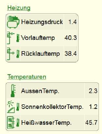 define Temperaturen readingsGroup myKm200:<%temp_temperature>,<AussenTemp.>,/system/sensors/temperatures/outdoor_t1 myKm200:<%sani_solar_temp><SonnenkollektorTemp.>,/solarCircuits/sc1/collectorTemperature myKm200:<%sani_buffer_temp_all>,<HeißwasserTemp.>,/system/sensors/temperatures/hotWater_t2